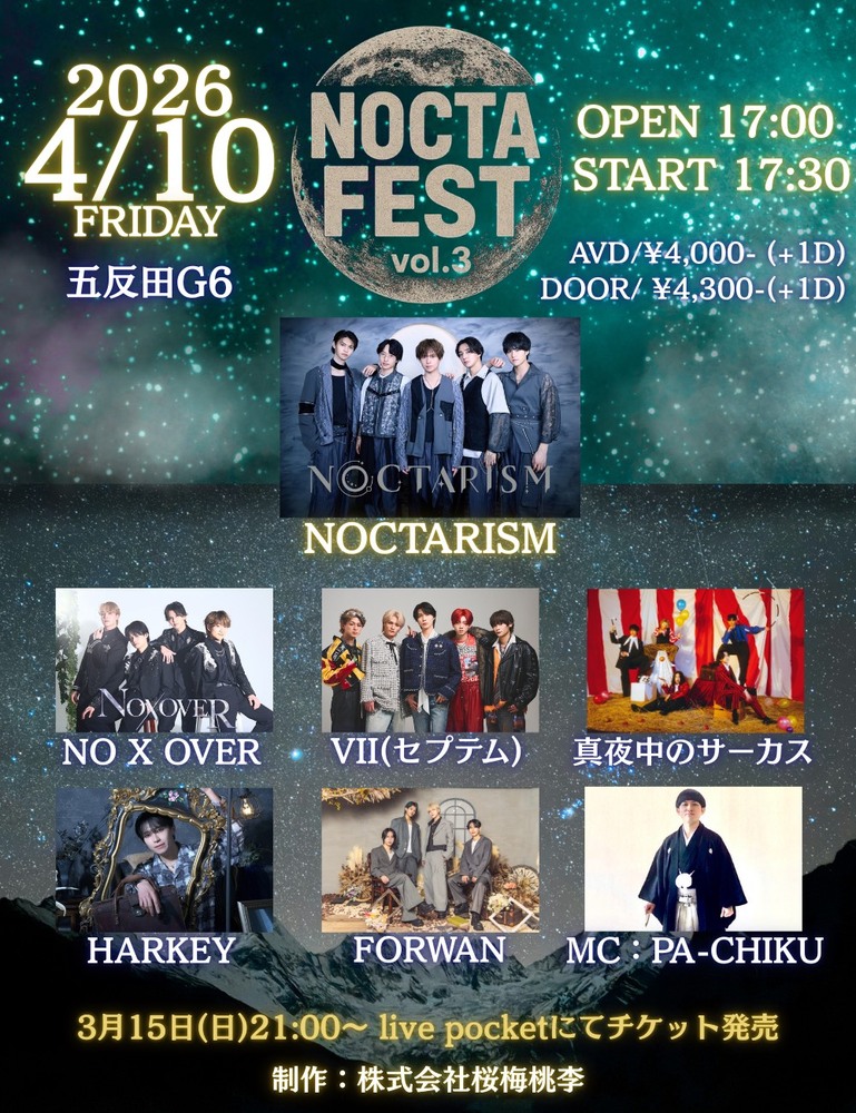 【真夜中のサーカス】NOCTA FEST Vol.3 SCHEDULE 2026/04/10(金) GOTANDA G6 地図を表示 【日程】 2026年4月10日(金) OPEN17:00 / START17:30 🎪真夜中のサーカス 18:25〜 チケットはこちら URLをコピーする 報告する