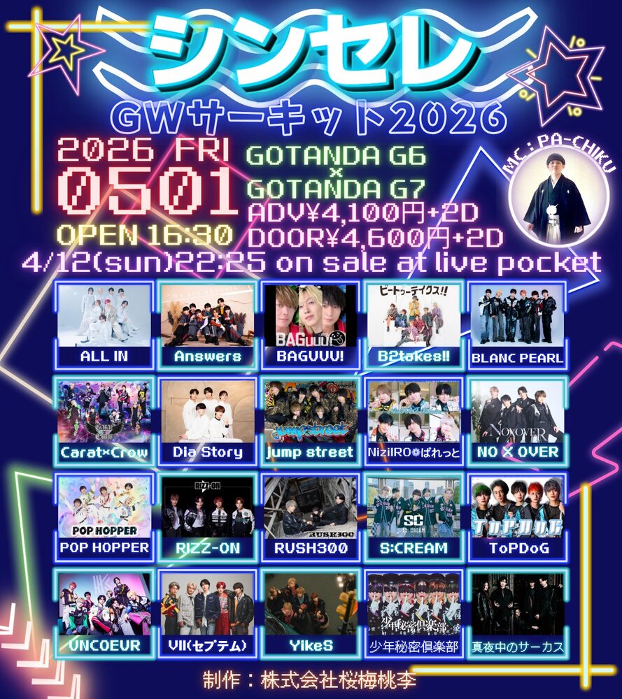 【真夜中のサーカス】シンセレGWサーキット2026 SCHEDULE 2026/05/01(金) GOTANDA G7 地図を表示 【日程】 2026年5月1日(金) OPEN 16:30 / START 17:15 🎪真夜中のサーカス START 18:45 チケットはこちら URLをコピーする 報告する