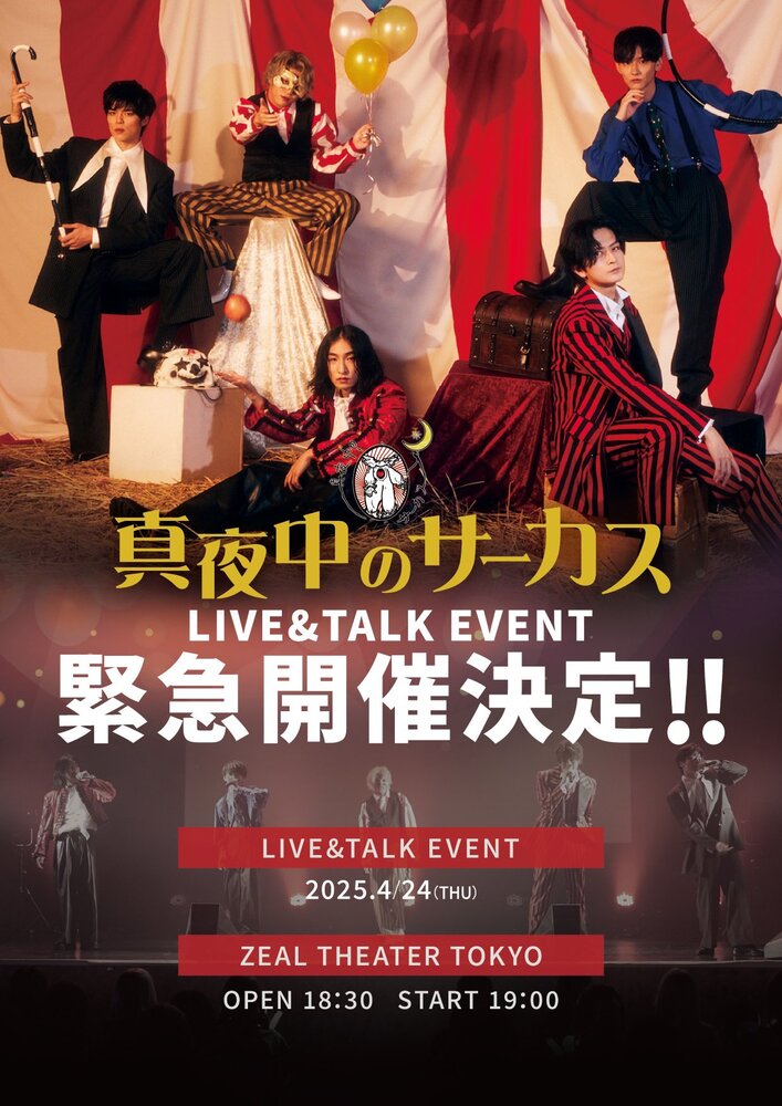 【真夜中のサーカス】LIVE &TALK EVENT SCHEDULE 2025/04/24(木) 18:30 - ZEAL THEATER TOKYO 地図を表示 チケット詳細はこちら URLをコピーする 報告する