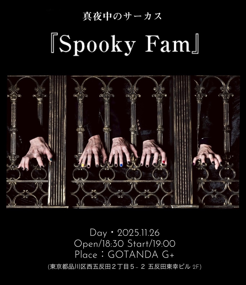 【真夜中のサーカス】Spooky Fam SCHEDULE 2025/11/26(水) 19:00 - Gotanda G+ 地図を表示 【時間】 Open 18:30 / Start 19:00 【会場】 Gotanda G + 東京都品川区西五反田二丁目5−2 2階 URLをコピーする 報告する